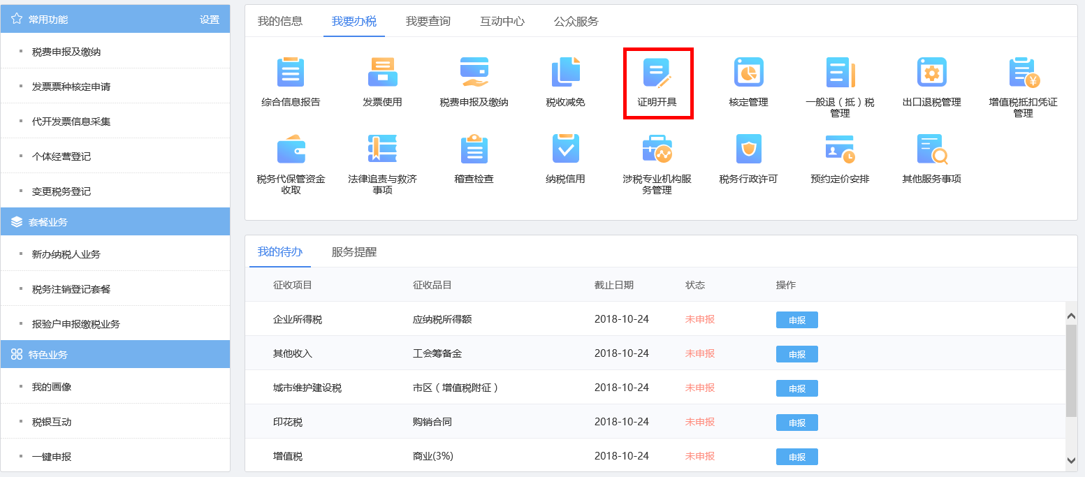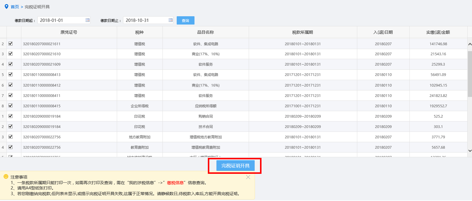 首页→〖我要办税〗→〖证明开具〗→〖开具税收完税(费)证明〗