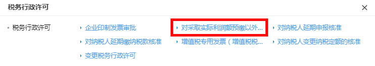 1.首页点击【税务行政许可】业务按钮,选择“对采取实际利润额预缴以外的其他企业所得税预缴方式的核定”进入,如图