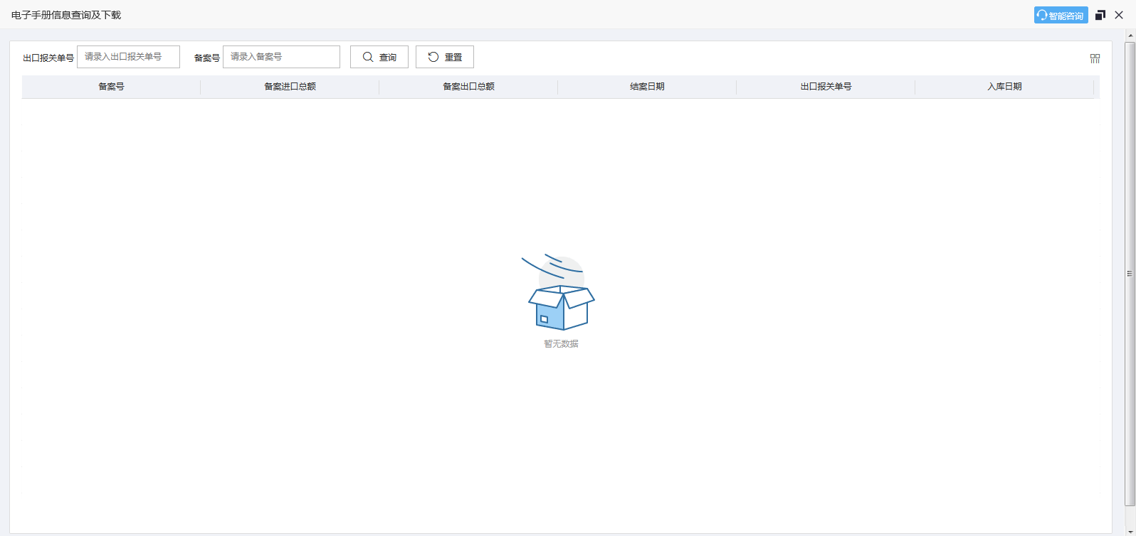 输入查询条件“出口报关单号”或“备案号”,可查询相关电子手册信息。