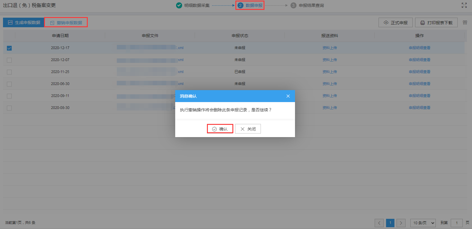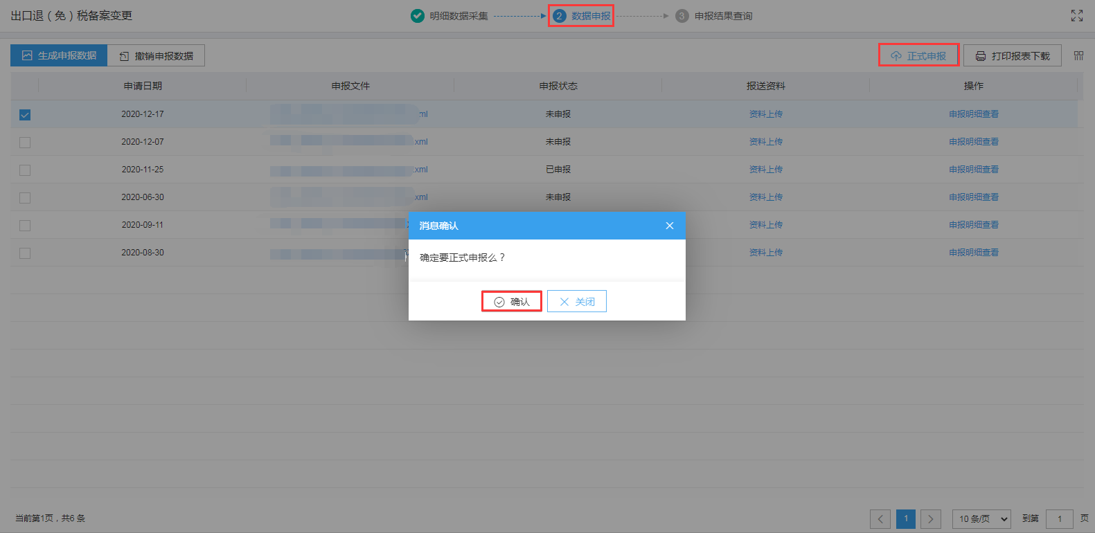 勾选数据,点击“正式申报”按钮,系统弹窗提示“确定要正式申报么?”,点击“确认”按钮,可将数据正式申报。如图: