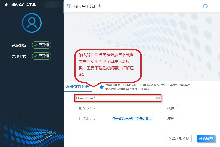 3.解密报关单:解压客户端工具压缩包后,双击运行客户端工具。电脑上插入电子口岸卡,输入口岸卡密码,在“海关文件”处选择已下载至本地电脑的XML格式的报关单,点击“开始解密”按钮,进行出口报关单解密。如图: