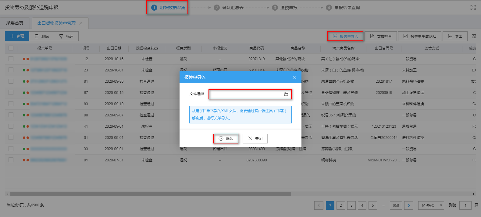 点击“报关单导入”按钮,选择解密后的XML文件,点击“确认”按钮,完成关单导入。如图: