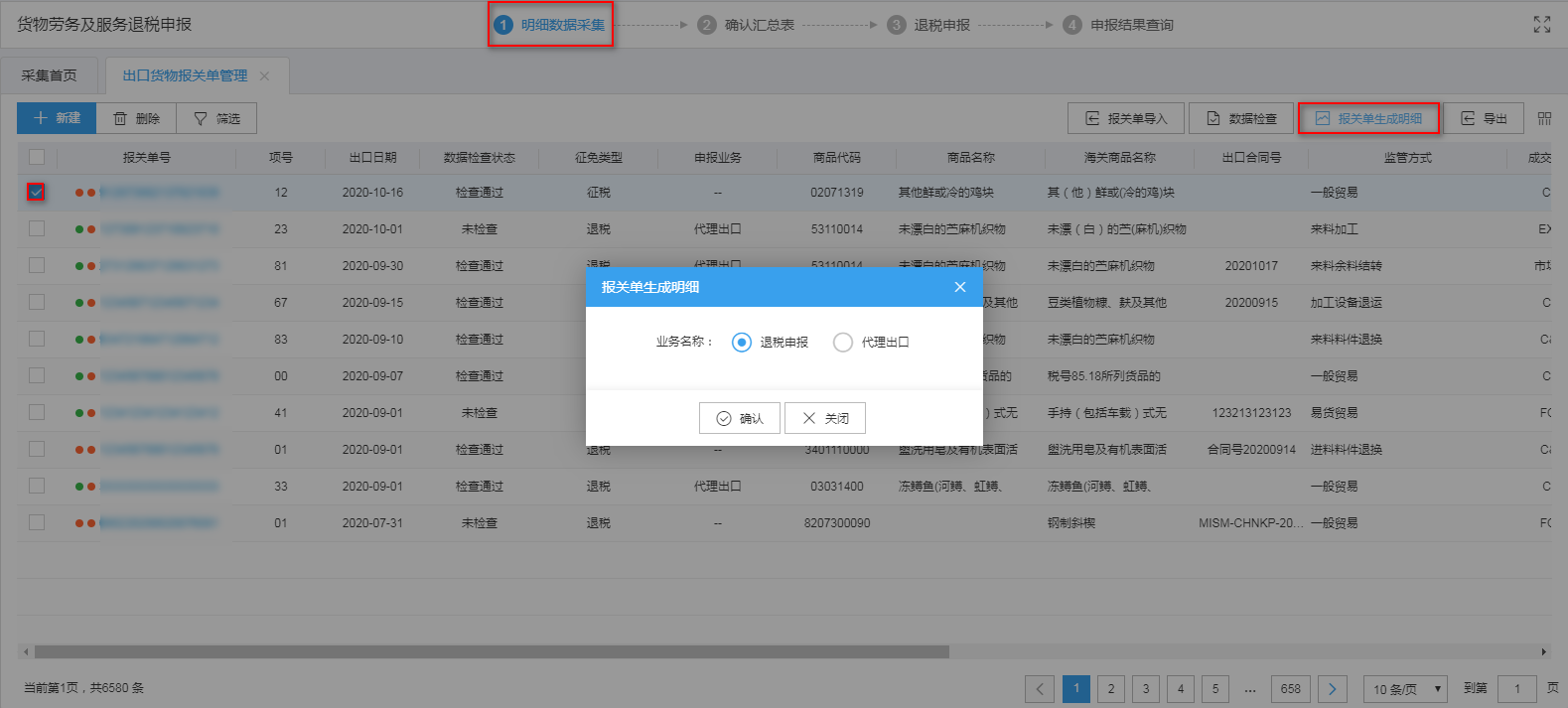 勾选检查通过的数据,点击“报关单生成明细”按钮,根据系统弹窗提示选择对应业务名称,点击“确认”按钮,界面跳转至“生成出口明细”界面。如图: