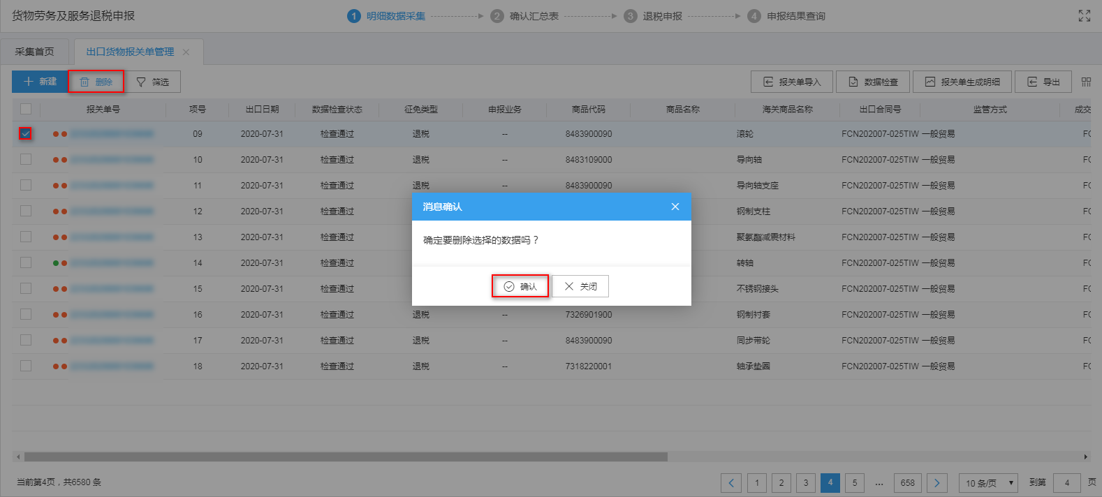 勾选需要删除的关单记录,点击“删除”按钮,弹出消息确认提示框,点击“确认”按钮,即可删除数据。如图: