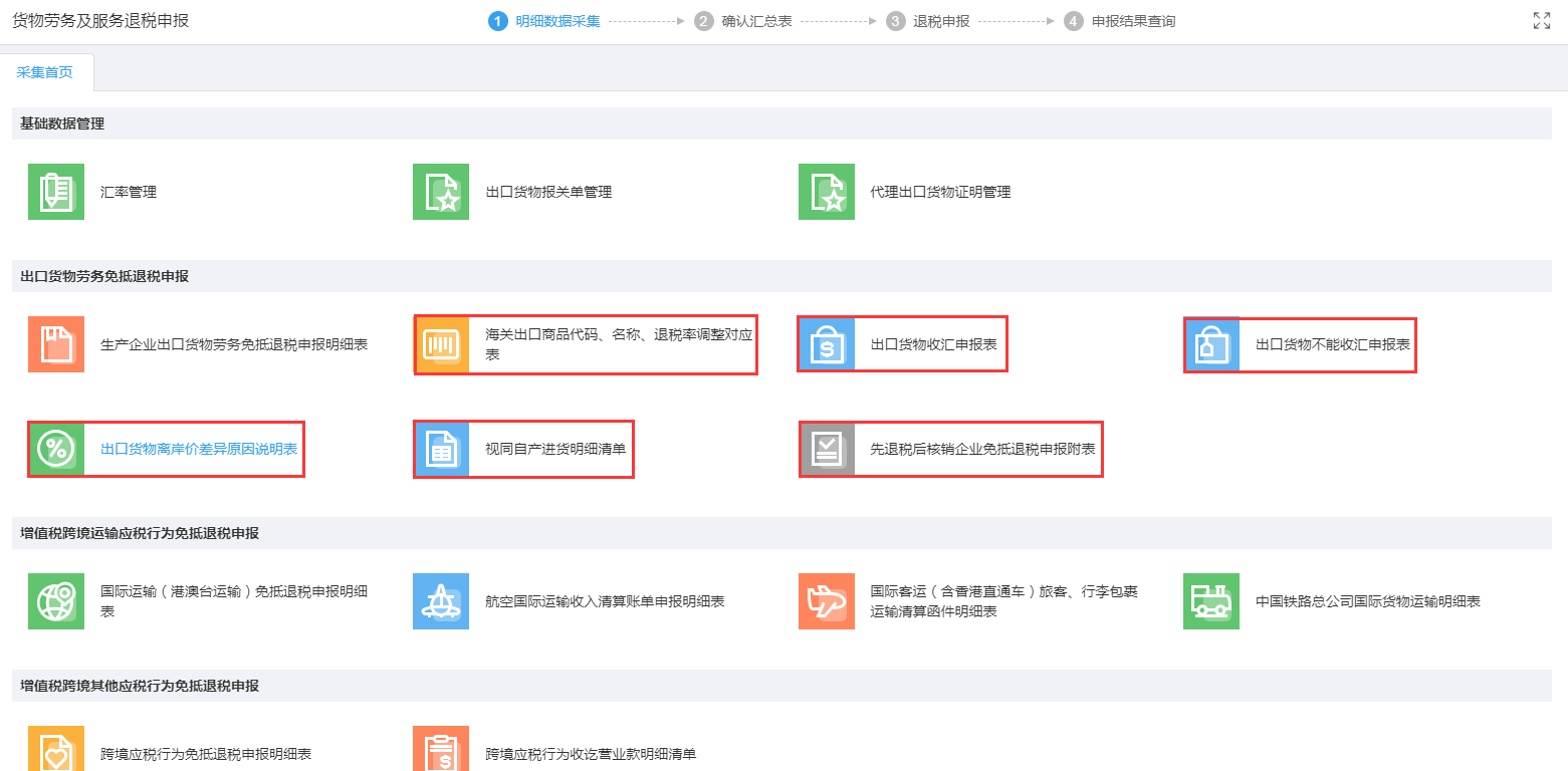 根据企业的业务情况可在此菜单对以下业务数据进行采集:“海关出口商品代码、名称、退税率调整对应表”、“出口货物收汇申报表”、“出口货物不能收汇申报表”、“出口货物离岸价差异原因说明表”、“视同自产进货明细清单”、“先退税后核销企业免抵退税申报附表”,点击后可进入对应表单界面。如图: