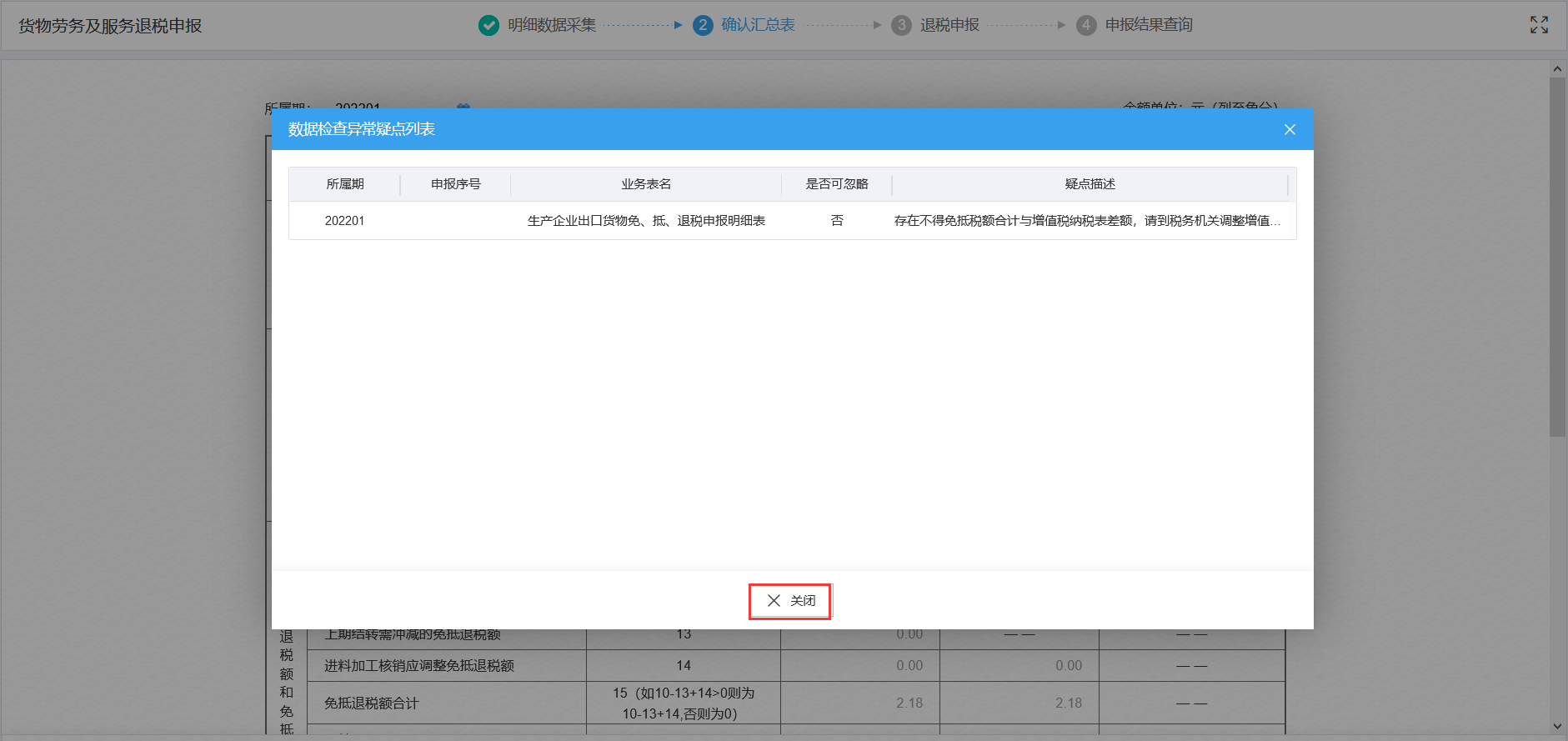 系统弹出“数据检查异常疑点列表”,核对所属期、申报序号、业务表名、是否可忽略、疑点描述,出现可忽略疑点时,点击“关闭”按钮,跳转至汇总表界面;若出现不可忽略疑点时,返回“明细数据采集”界面,按照疑点描述进行数据修改。如图: