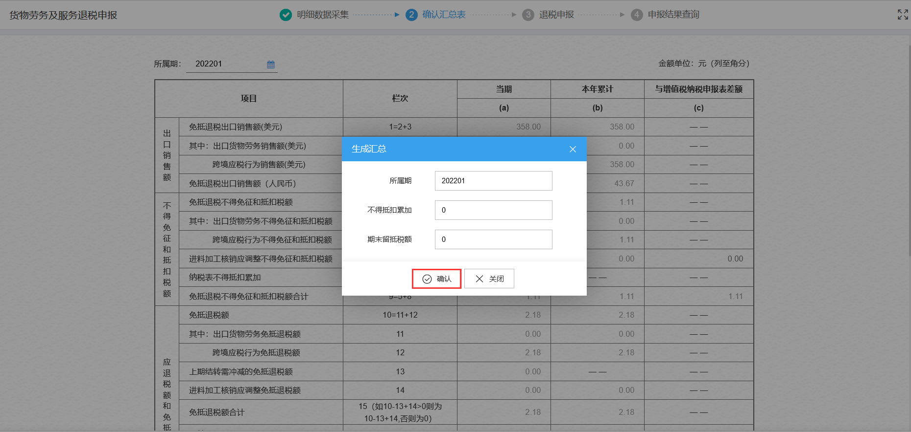 点击“确认汇总表”模块,弹出生成汇总弹窗,填写对应的“所属期”、“不得抵扣累加”、“期末留抵税额”,点击“确认”按钮,即可生成汇总。如图: