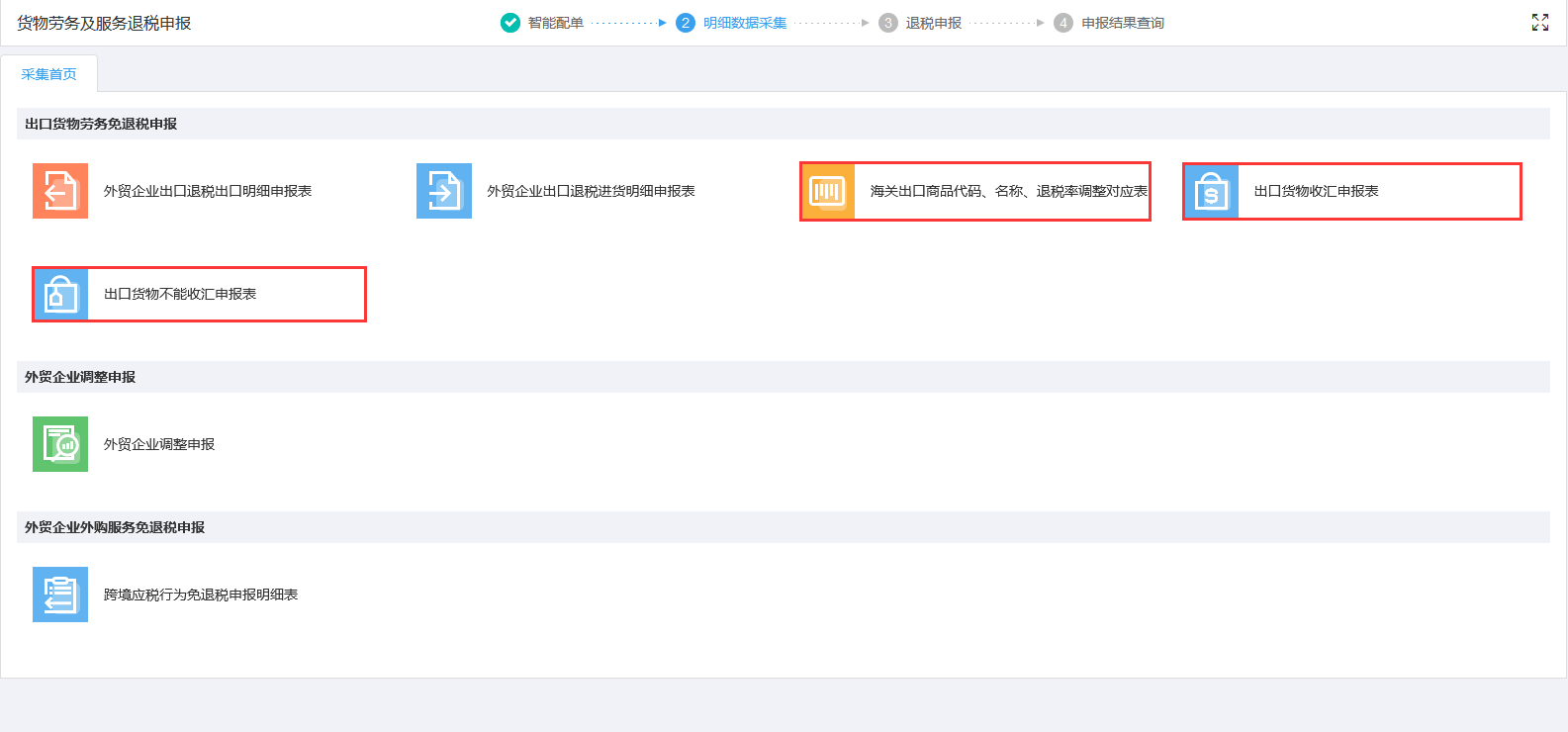 出口退(免)税,属于免退税计算方法的货物数据,根据企业的业务情况可在此菜单对以下业务数据进行采集:“海关出口商品代码、名称、退税率调整对应表”、“出口货物收汇申报表”、“出口货物不能收汇申报表”,点击后可进入对应表单界面。如图: