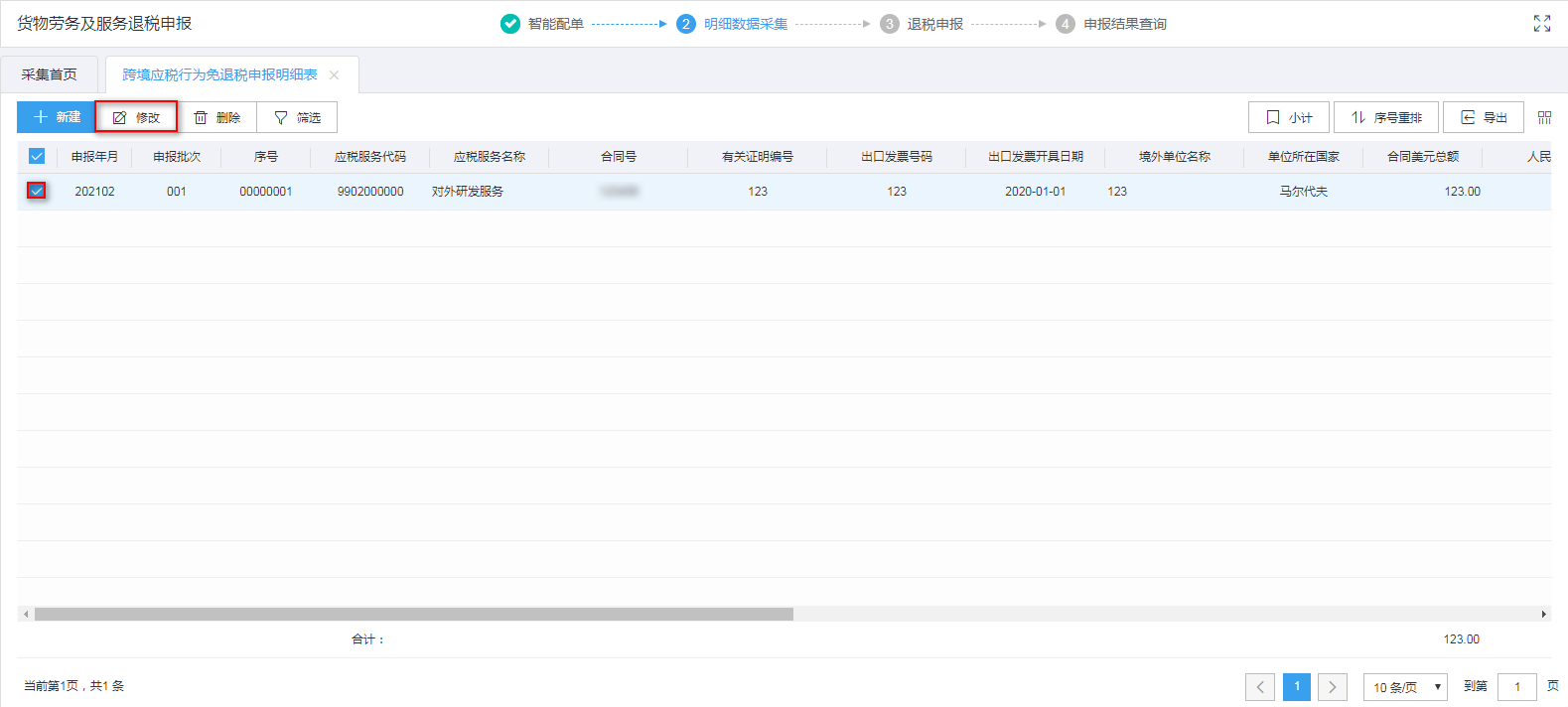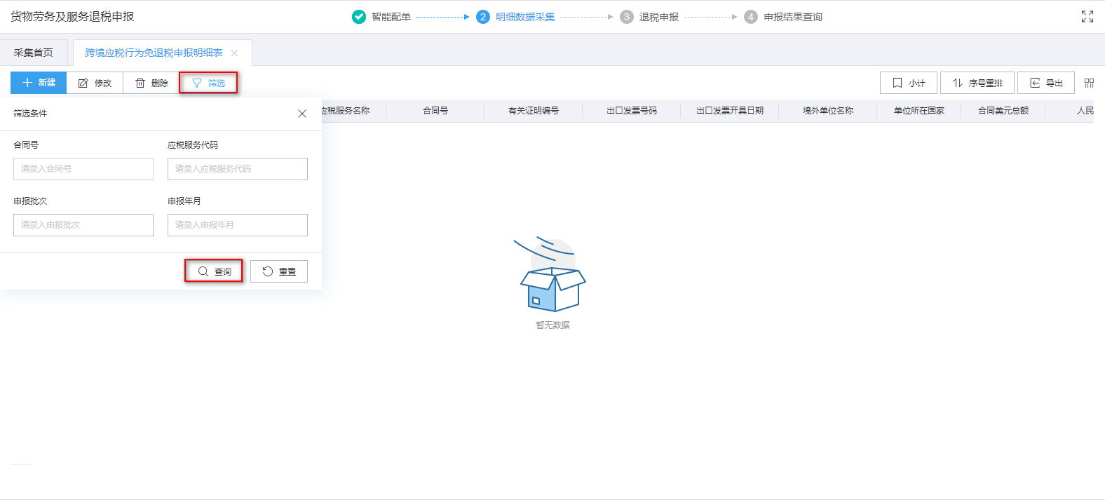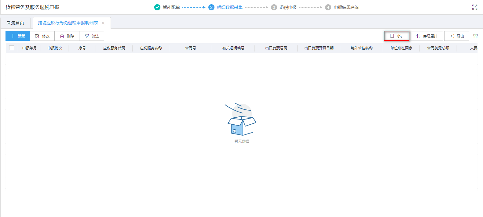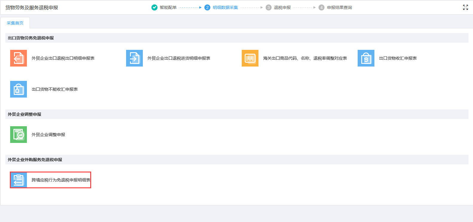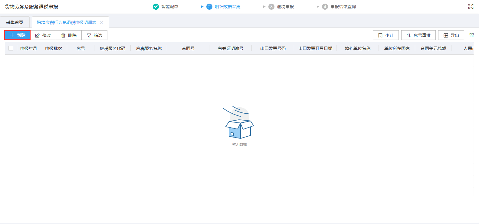 外贸企业有外购服务免退税业务的用户需要申报该表单,点击跨境应税行为免退税申报明细表进行采集。如图: