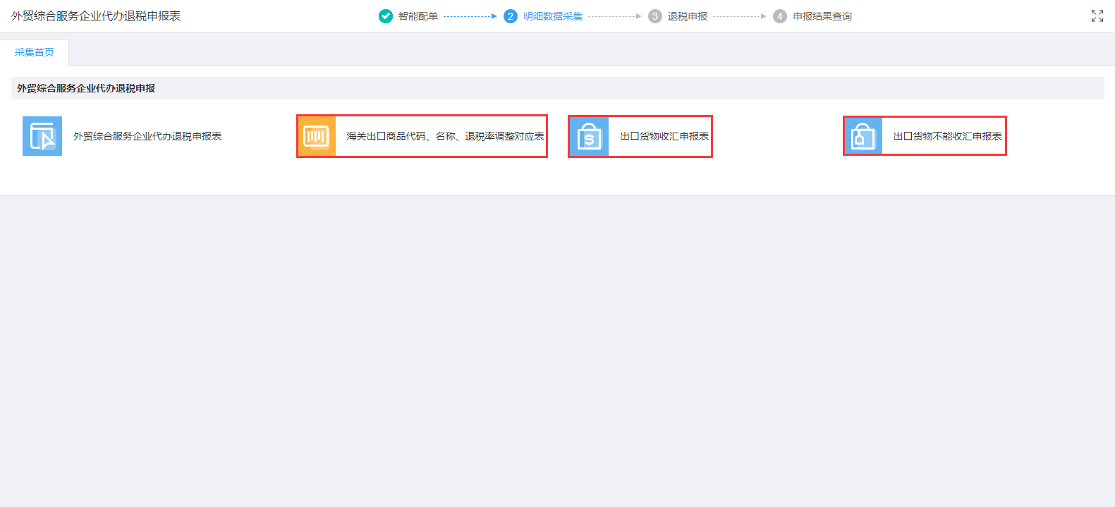 根据企业的业务情况可在此菜单对以下业务数据进行采集:“海关出口商品代码、名称、退税率调整对应表”、“出口货物收汇申报表”、“出口货物不能收汇申报表”,点击后可进入对应表单界面。如图: ![](https://img.kancloud.cn/fa/c3/fac33afb04c3b89e855e4a9e38c8d83f_1581x719.png)
