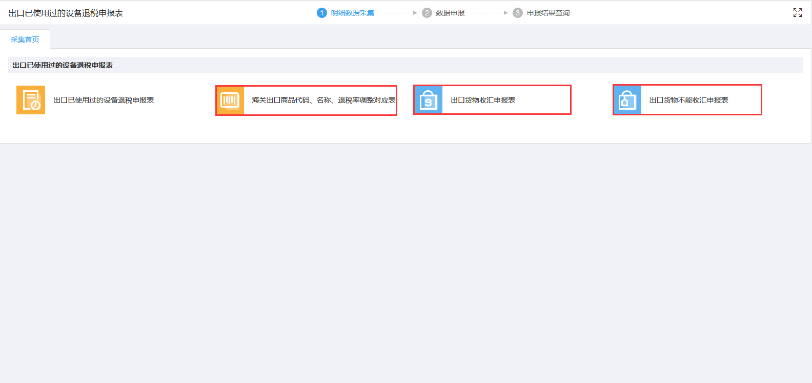 根据企业的业务情况可在此菜单对以下业务数据进行采集:“海关出口商品代码、名称、退税率调整对应表”、“出口货物收汇申报表”、“出口货物不能收汇申报表”,点击后可进入对应表单界面。如图: ![](https://img.kancloud.cn/1d/f4/1df4d96fe6ff2a70d9f35eb9d103f4d9_1584x747.png)