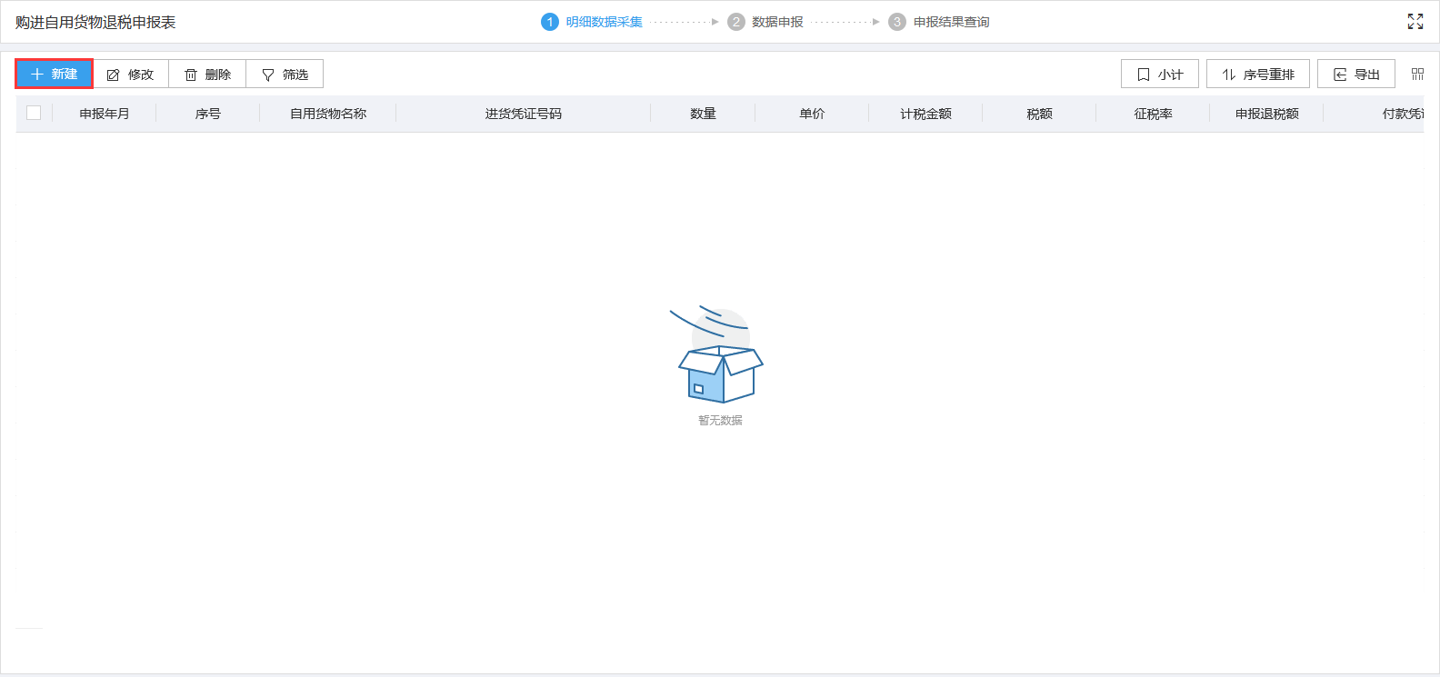 在购进自用货物退税申报页面,点击“新建”按钮,页面将弹出采集框,如图: