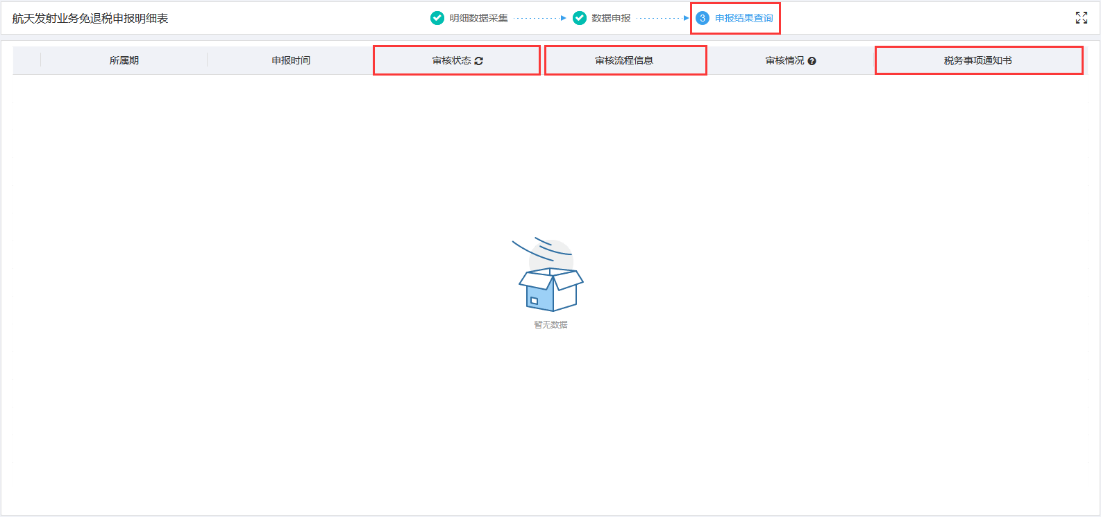 数据转为正式申报后,可在申报结果查询界面查看申报后的审核状态。审核状态显示为“审核成功”,则说明数据已经正式审核通过。税务事项通知书可查看税务机关受理结果。如图: ![](https://img.kancloud.cn/4d/db/4ddb6f0dec1827f047a0953738f5d9b9_1586x746.png)