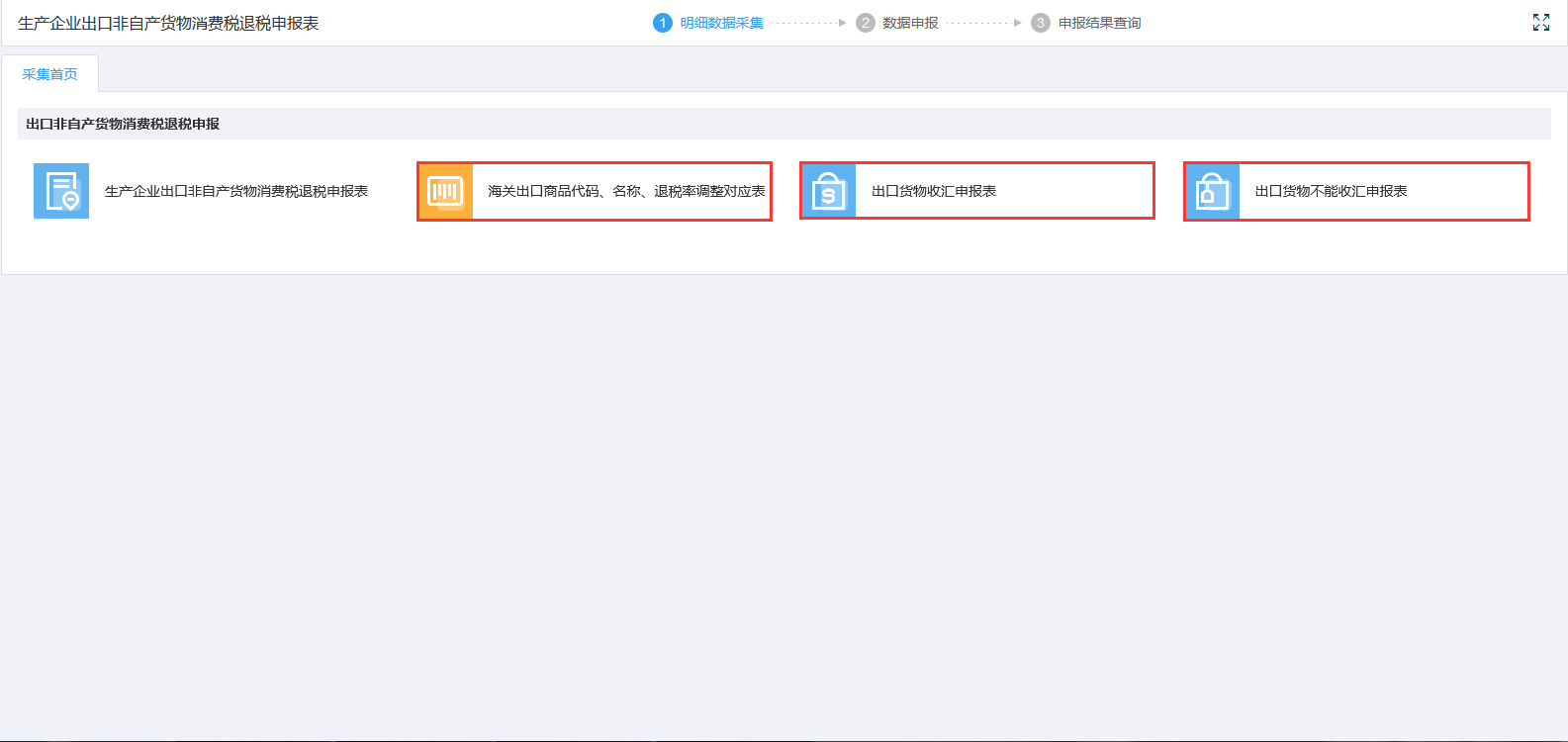 根据企业的业务情况可在此菜单对以下业务数据进行采集:“海关出口商品代码、名称、退税率调整对应表”、“出口货物收汇申报表”、“出口货物不能收汇申报表”,点击后可进入对应表单界面。如图: