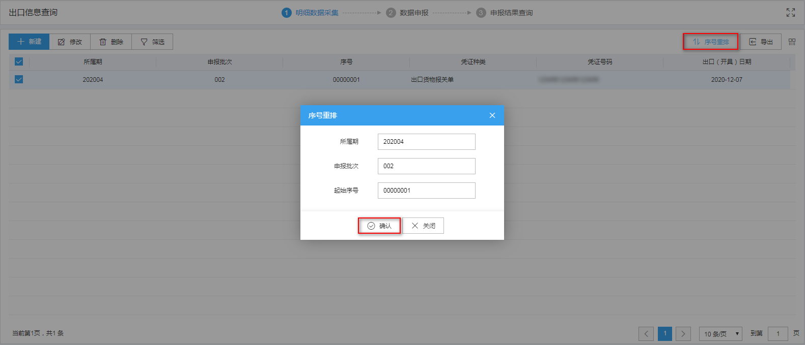 需要序号重排,可点击“序号重排”按钮,输入起始序号,点击“确认”按钮进行重新排序。如图: