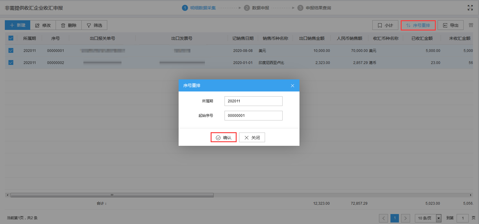 需要序号重排,可点击“序号重排”按钮,输入起始序号,点击“确认”按钮进行重新排序。如图: