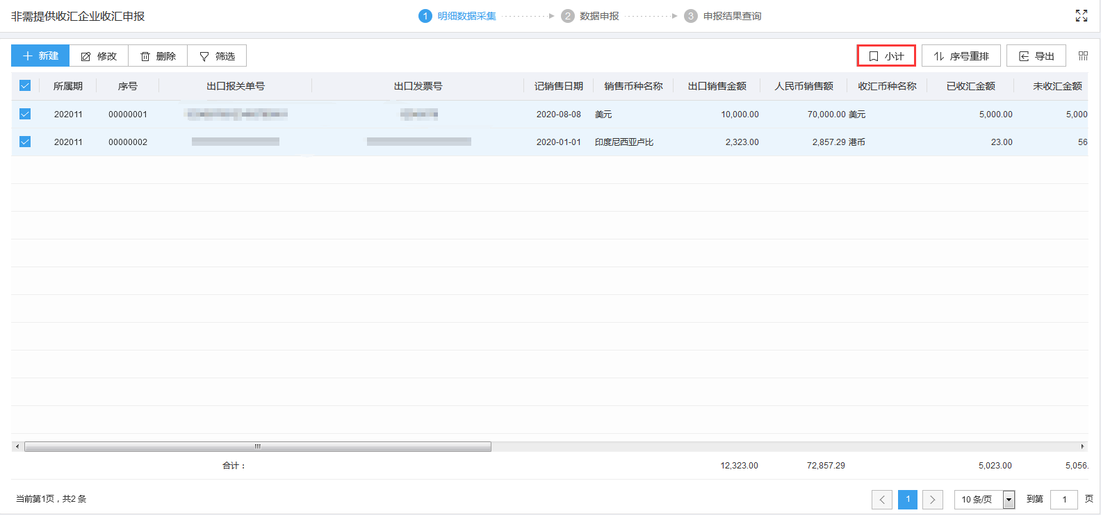 需要统计数据时,可点击“小计”按钮查看小计结果。如图: