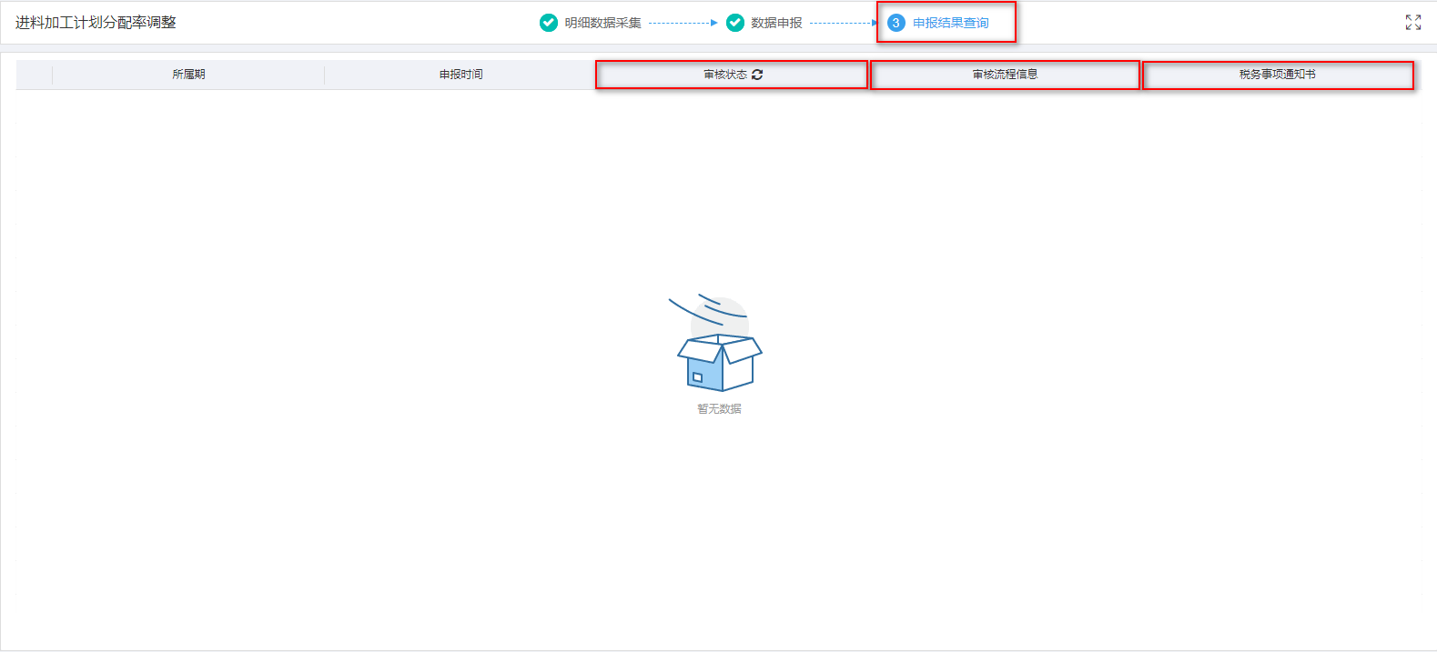 数据转为正式申报后,可在申报结果查询界面查看申报后的审核状态。审核状态显示为“审核成功”,则说明数据已经正式审核通过。税务事项通知书可查看税务机关受理结果。如图: ![](https://img.kancloud.cn/f7/d8/f7d8b41e9056aa9462ca1bc771ff3102_1579x717.png)