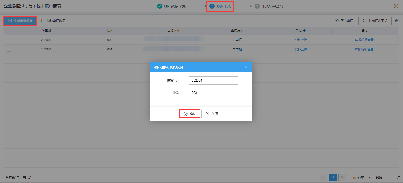 点击“生成申报数据”按钮,输入正确的所属期和批次,点击“确认”按钮,可生成申报数据。如图: