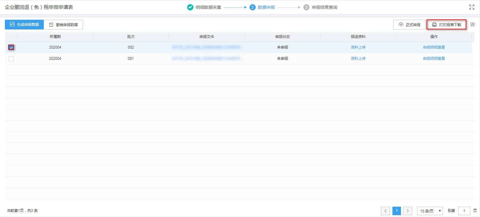 勾选已生成的数据,点击“打印报表下载”按钮,将报表保存至本地电脑后,进行表单打印。如图:
