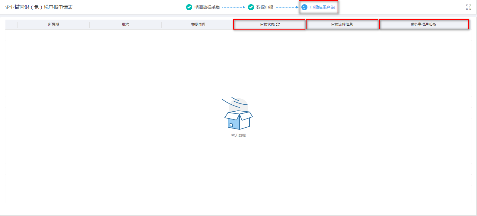 数据转为正式申报后,可在申报结果查询界面查看申报后的审核状态。审核状态显示为“审核成功”,则说明数据已经正式审核通过。税务事项通知书可查看税务机关受理结果。如图: ![](https://img.kancloud.cn/18/9f/189f8b07cf4a18e9ed95dcd1df9325e5_1581x716.png)