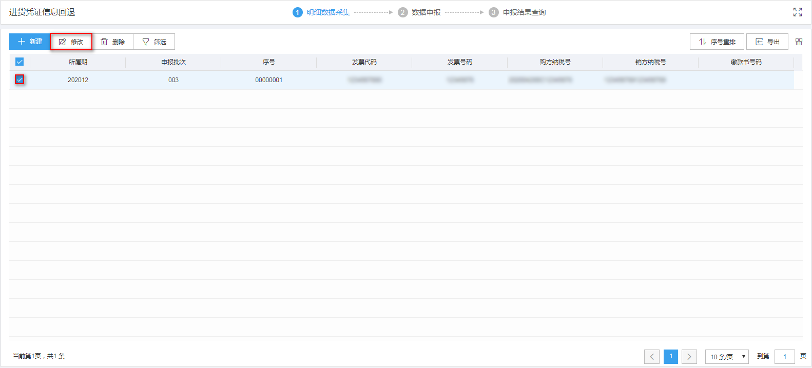 需要修改数据时,勾选需要修改的记录,点击“修改”按钮进行修改。如图: