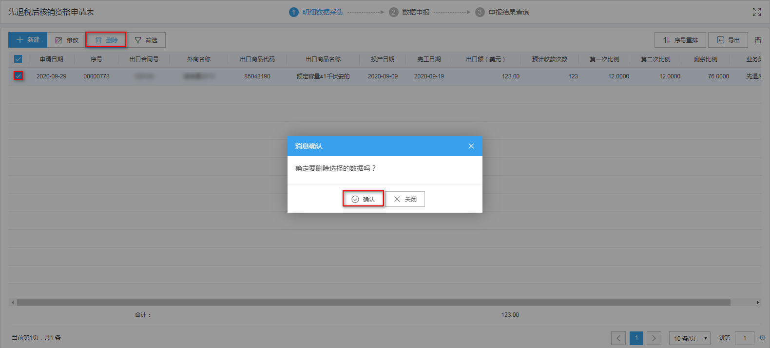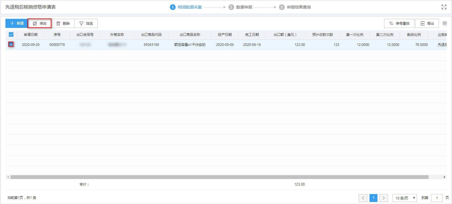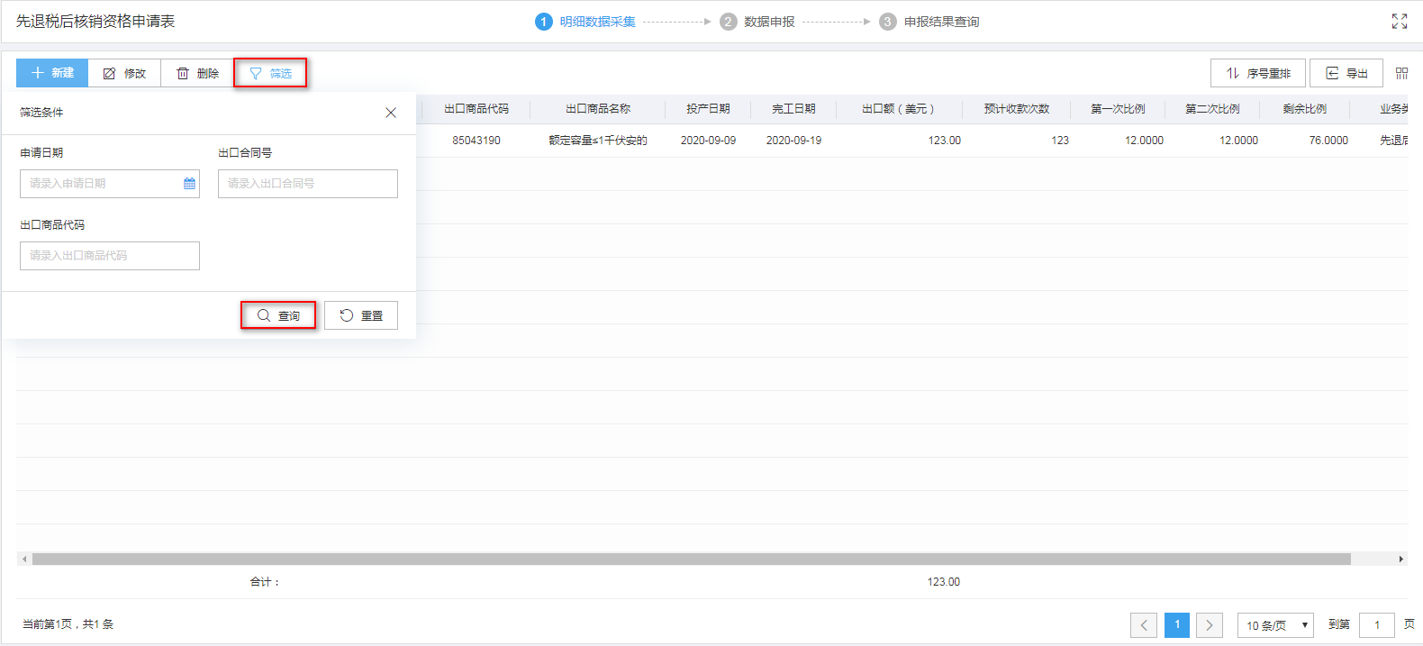 明细数据采集菜单可以对单证数据进行录入采集,同时可以利用筛选条件和功能按钮,对已录入数据进行增、删、改、查等操作。
