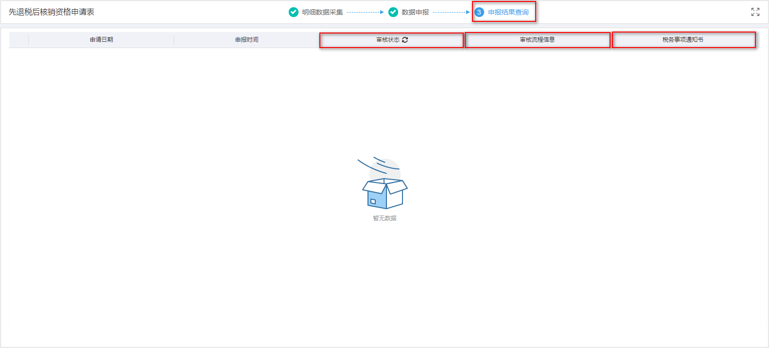 数据转为正式申报后,可在申报结果查询界面查看申报后的审核状态。审核状态显示为“审核成功”,则说明数据已经正式审核通过。税务事项通知书可查看税务机关受理结果。如图: ![](https://img.kancloud.cn/f6/3c/f63cfd2284e1389141e777971560436b_1582x717.png)
