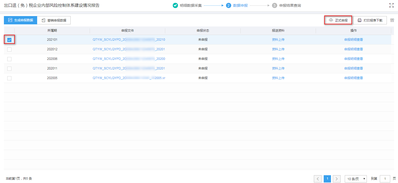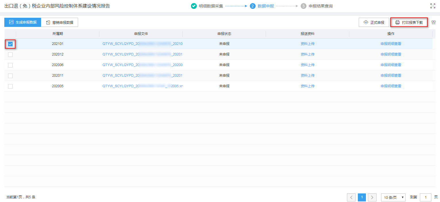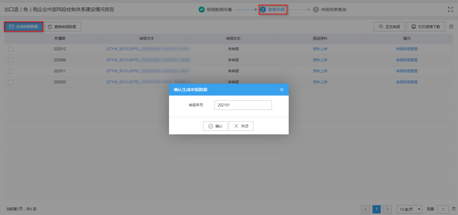 1、生成申报数据 点击“生成申报数据”按钮,输入正确的所属期,点击“确认”按钮,可生成申报数据。如图: ![](https://img.kancloud.cn/2a/9c/2a9c1d994076821d25ed4d8096e8d3f5_1531x720.png) 2、正式申报 勾选数据,点击“正式申报”按钮,系统弹窗提示“确定要正式申报么?”,点击“确认”按钮,可将数据转为正式申报。如图: ![](https://img.kancloud.cn/94/bd/94bd0814309bb2d91b6265687967344d_1532x706.png) 3、撤销申报数据 勾选已生成的数据,点击“撤销申报数据”按钮,可撤销数据至数据采集界面,根据疑点提示进行数据修改。如图: ![](https://img.kancloud.cn/41/ca/41ca3e3c1375b6a1e4ad90e6bc8edb42_1532x706.png) 4、打印报表下载 勾选已生成的数据,点击“打印报表下载”按钮,将报表保存至本地电脑后,进行表单打印。如图: ![](https://img.kancloud.cn/f4/fd/f4fd653b81098ca383e6fad032ce783a_1532x706.png) 5、申报明细查看 点击“申报明细查看”可查看已经生成的申报数据明细。如图: ![](https://img.kancloud.cn/eb/39/eb392b758a4d710972e0a2b5868ac69d_1532x706.png) ![](https://img.kancloud.cn/57/c7/57c7f82c94f82818b87f0b7a62f93503_1200x728.png)