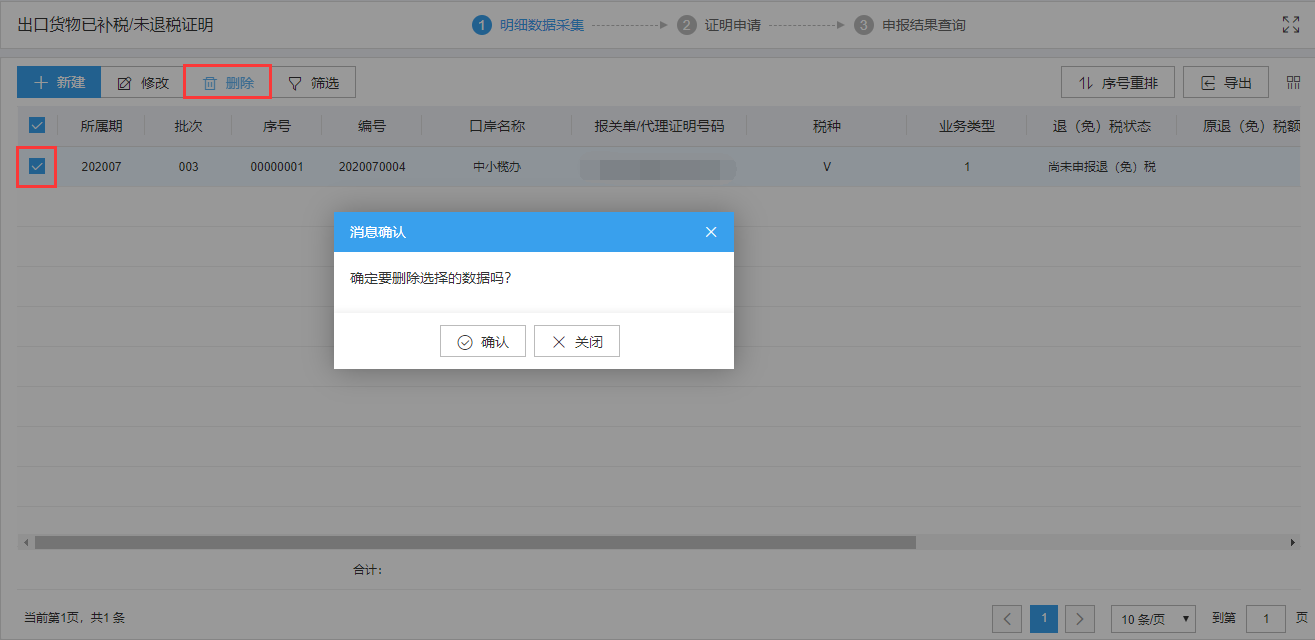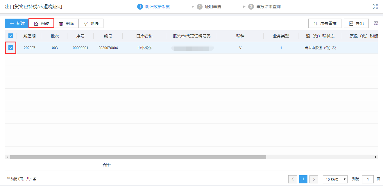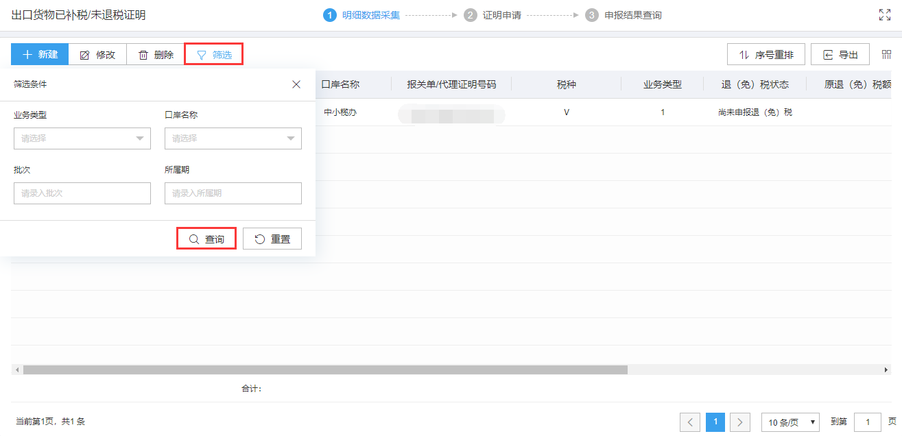明细数据采集菜单可以对单证数据进行录入采集,同时可以利用筛选条件和功能按钮,对已录入数据进行增、删、改、查等操作。