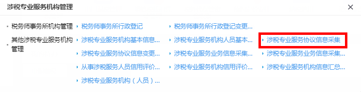 首页→〖我要办税〗→〖涉税专业机构服务管理〗→〖其他涉税专业服务机构管理〗→〖涉税专业协议信息采集〗