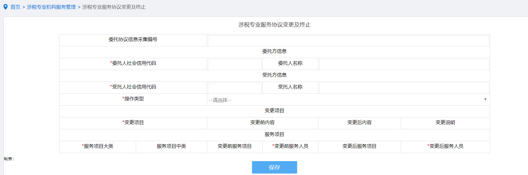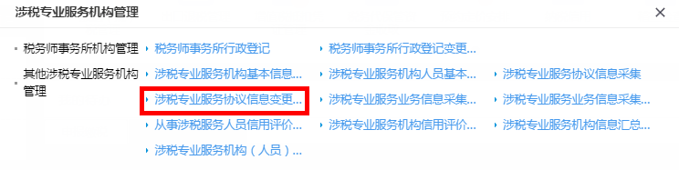 首页→〖我要办税〗→〖涉税专业机构服务管理〗→〖其他涉税专业服务机构管理〗→〖涉税专业服务协议信息变更及终止〗