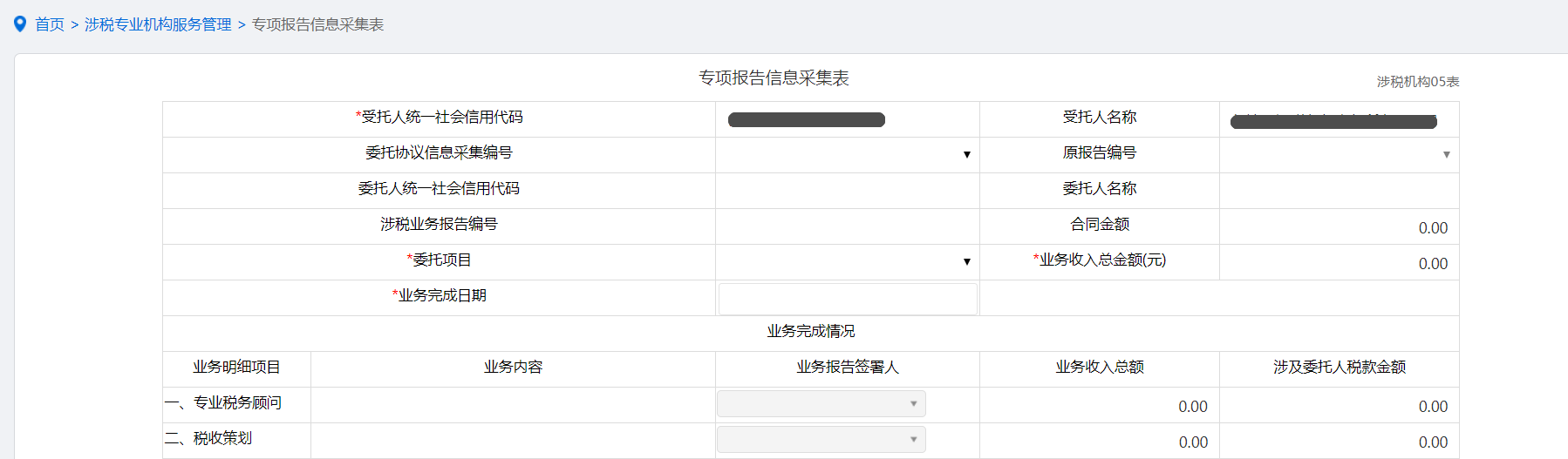 ②涉税专业服务机构专项报告,按照委托协议信息采集编号为主线,一项目一报。专项报告报送内容包括:专项业务基本信息、委托服务项目信息、服务情况摘要。