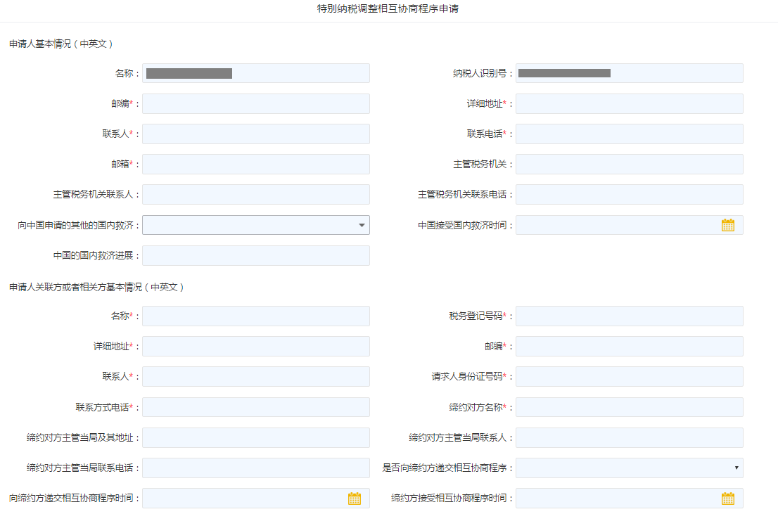 本表适用于特别纳税调整相互协商程序申请填写。