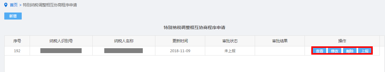 填写完成后,点击保存按钮,可点击“特别纳税调整相互协商程序申请”功能模块,查看、修改、删除、上报,如图