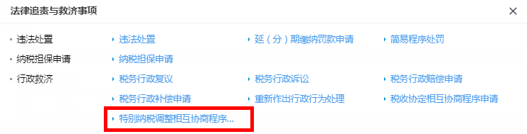 点击“法律追责与救济事项”功能模块,选择“特别纳税调整相互协商程序申请”进入,如图