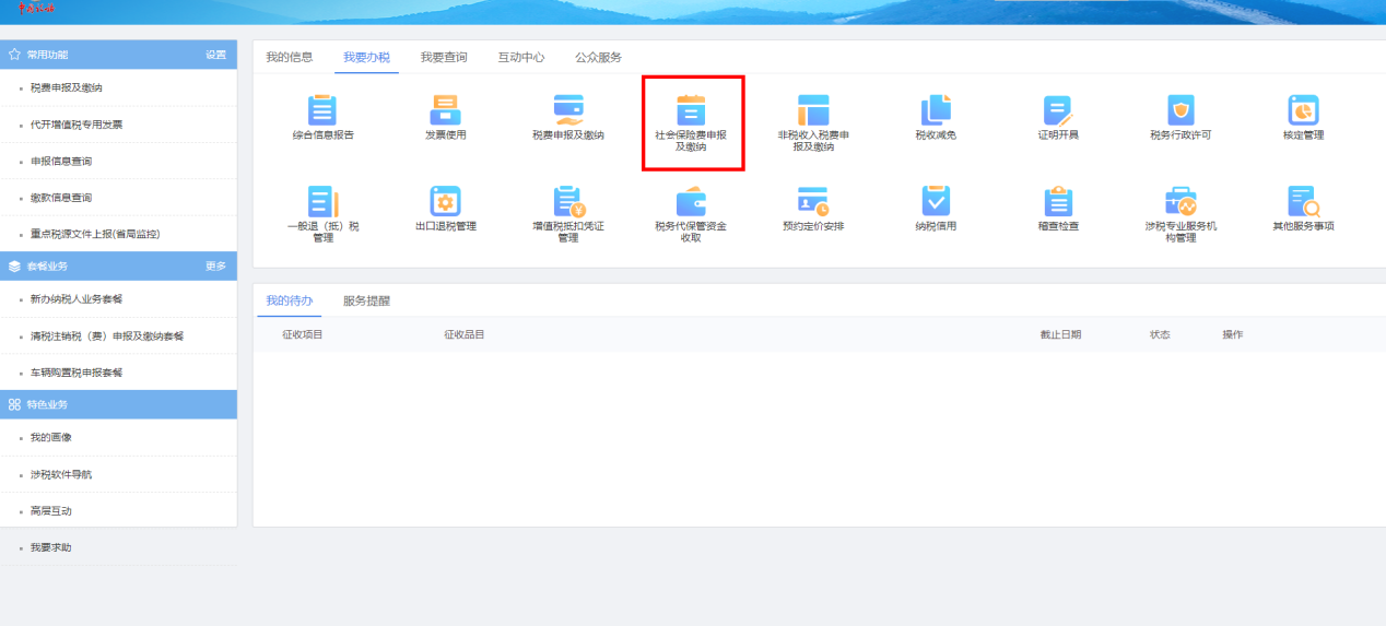 在首页下,点击“社会保险费申报及缴纳”,进入社保费相关模块。