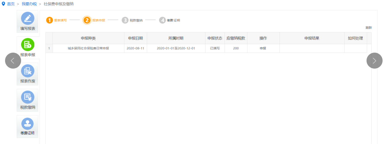 保存填写完的申报表,在报表申报列表中点击“申报”,申报后可点击“刷新”按钮查看申报状态及申报结果,如图: