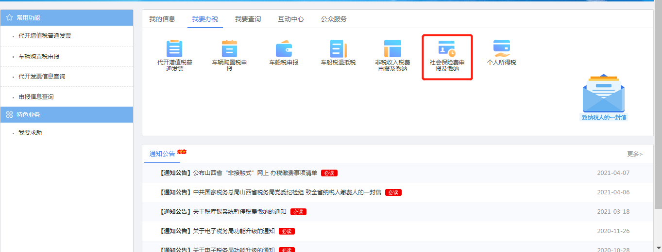 (1)注册完成登录后,在主页点击【我要办税】,选择【社会保险费申报及缴纳】