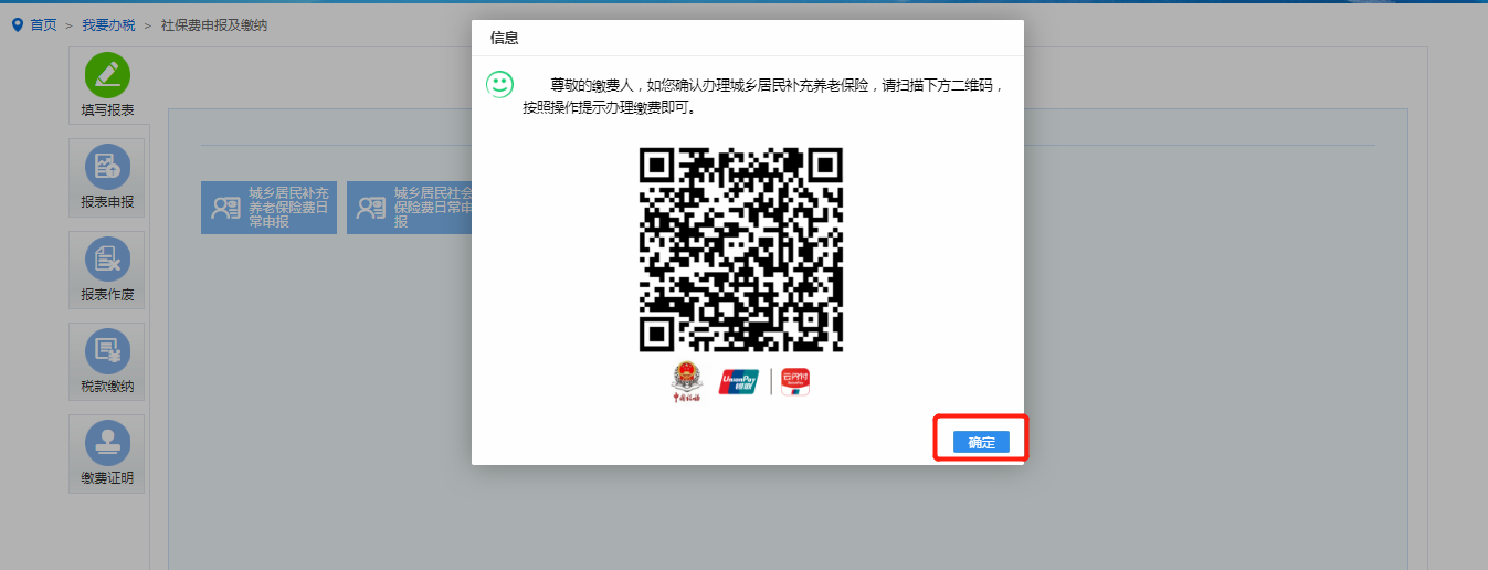 城乡居民补充养老保险费日常申报、灵活就业人员社会保险费申报扫描二维码跳转至微信端银联缴款。