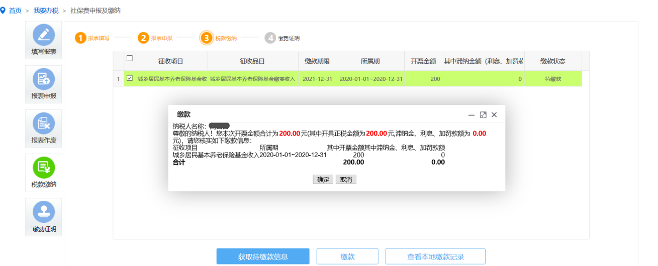 缴款方式支持自然人两两协议缴款,若申报后有应征税款的,在点击“获取缴款信息”可带出相应税款。点击“缴款”可完成税款缴纳,如图: