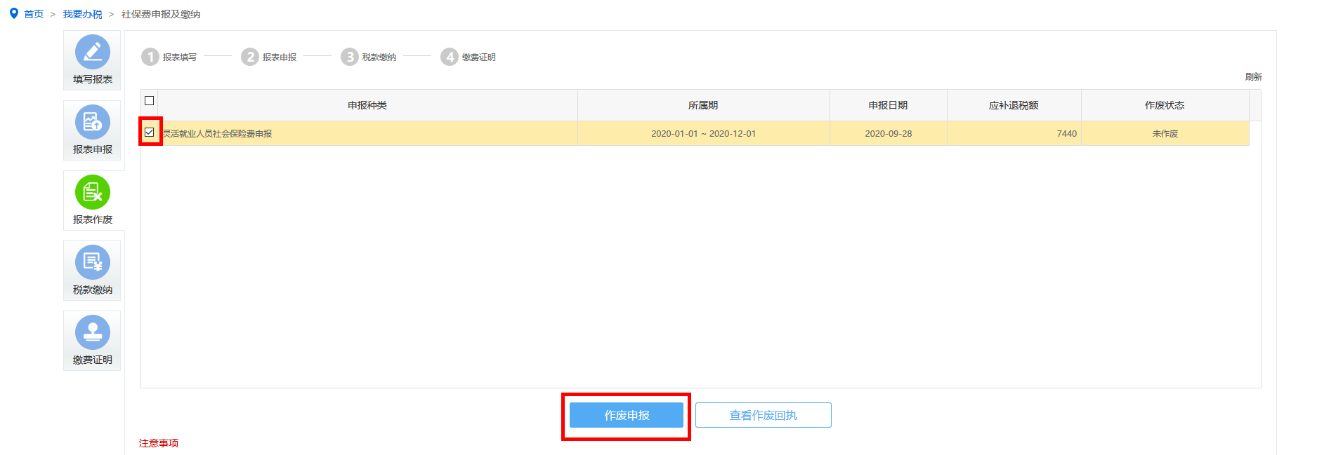 保存填写完的申报表,在报表作废列表中选择要作废的申报表点击“作废申报”按钮进行作废。