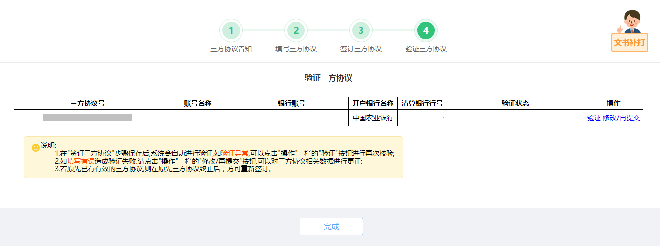 5.三方协议第四步,验证三方协议。查看验证状态,并可修改和再提交。