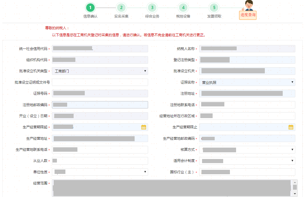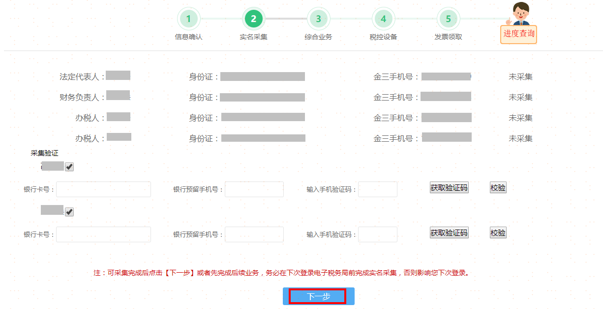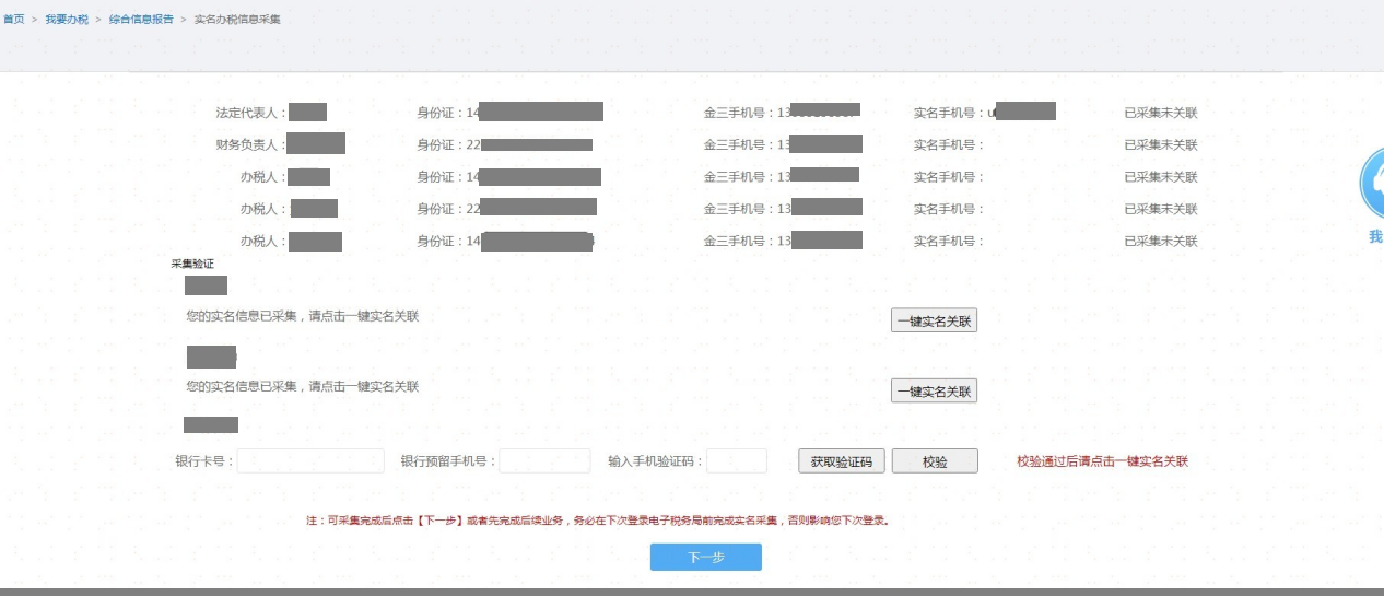 纳税人登录实名制采集系统,完成法定代表人、财务负责人和办税人员的实名信息采集,系统通过调用外部信息和智能判断等方式,自动完成《一照一码信息采集表》的采集,并推送给纳税人进行确认,纳税人确认无误后系统将信息传入金三后台。