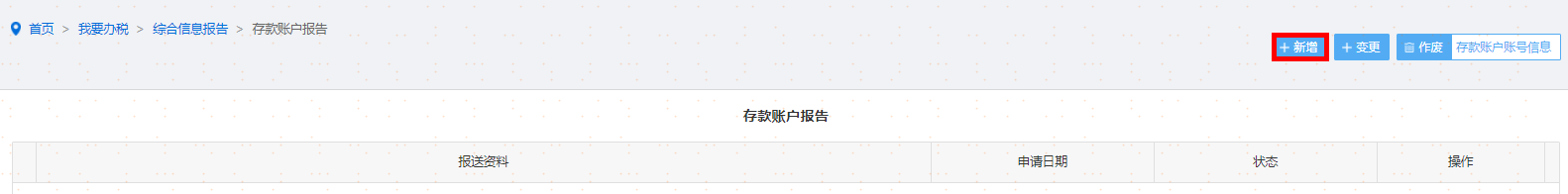 在综合业务办理环节,进入“存款账户报告”页面,点击右上角“新增报告”按钮,据实完成信息填写后,点击“保存”按钮提交。