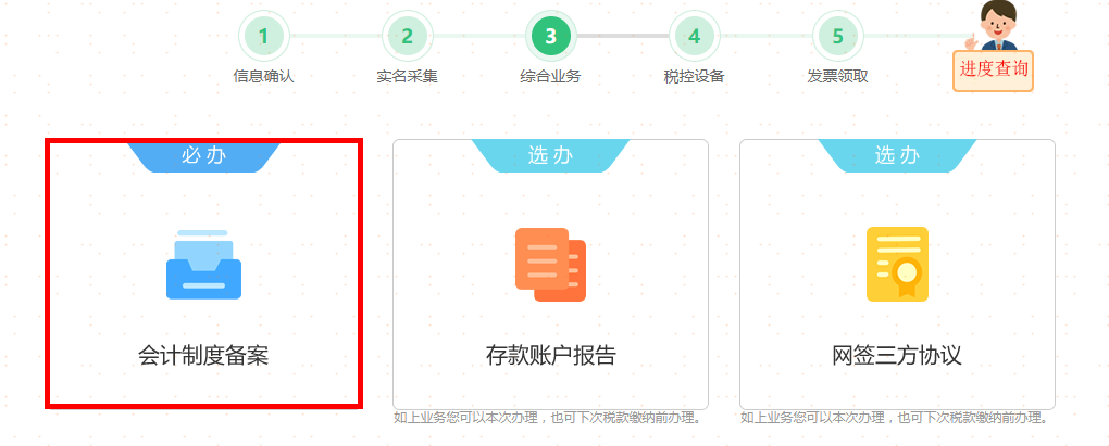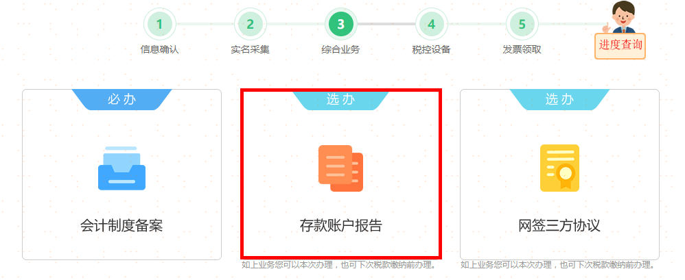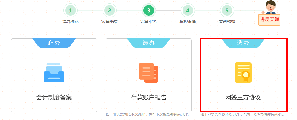 (为进一步提升纳税人体验,如您暂时不方便办理银行账户信息备案和三方协议签订业务,可先跳过本环节业务的办理,考虑到您后续办税需要,请您在具备条件后及时补办)