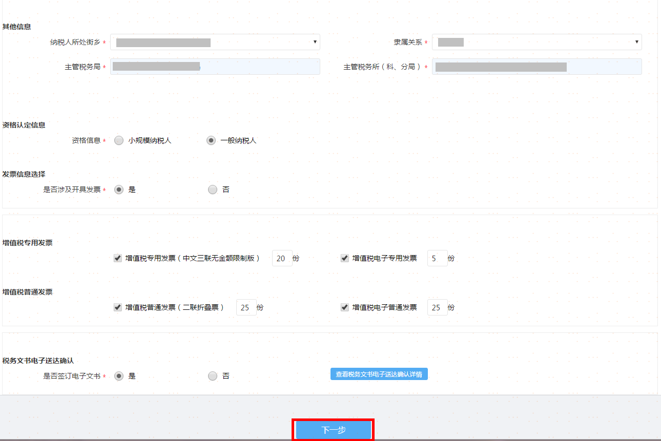 纳税人发票信息选择是否涉及开具发票为是时,可自主选择增值税专用发票25份和增值税普通发票50份。
