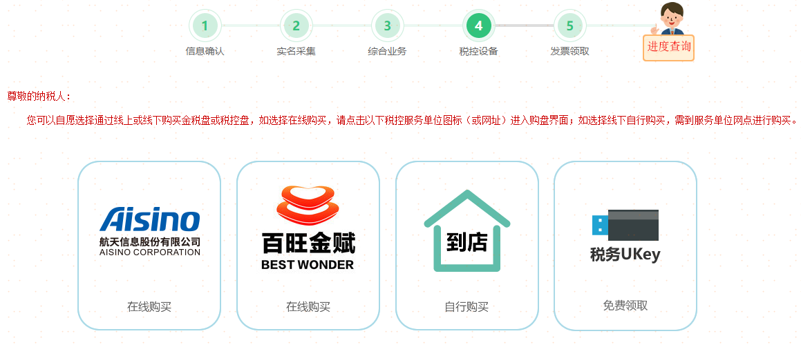 (电子税务局仅为您提供购买税控设备的入口,与税控设备购买无任何直接关系;如您申请使用的是电子发票,也可以选择税务部门免费提供的税务Ukey进行开票管理)