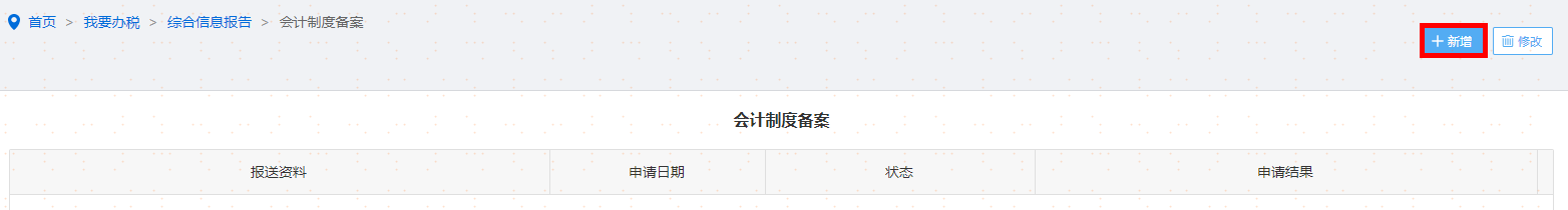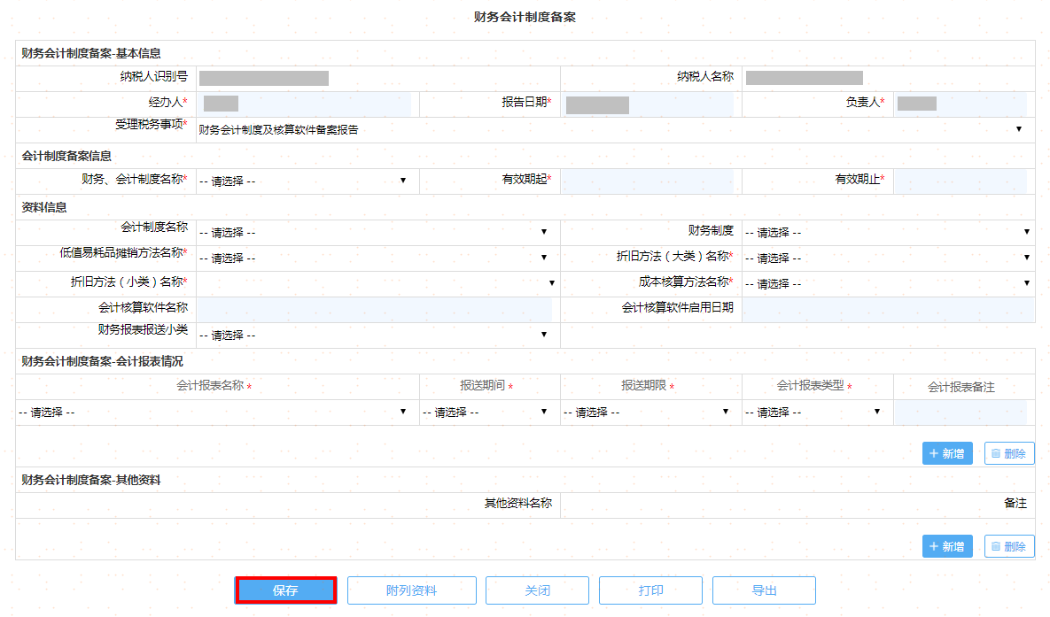 在综合业务办理环节,进入“会计制度备案”页面,点击页面右上角“新增备案”按钮,据实完成信息填写后,点击“保存”按钮,在当前页面显示“保存成功”后完成备案。
