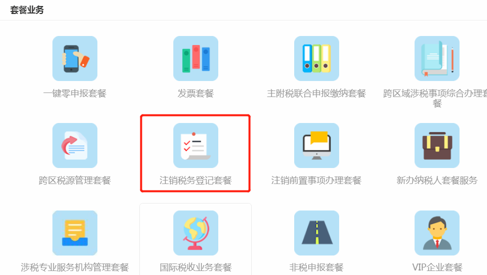 (1)登录成功后,在主界面点击“税务注销登记”套餐进入。